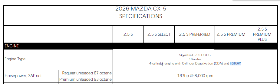 Mazda USA just published the 2026 CX-5 final spec deck PDF and it does show what we were seeing on the window stickers. All trims appear to have Cylinder Deactivation and i-stop though i-stop does have an asterisk and I don't see the footnote on it. It also has the Mazda can change this at any time lingo they put in there every year.