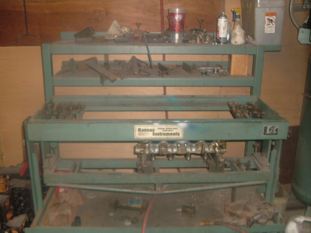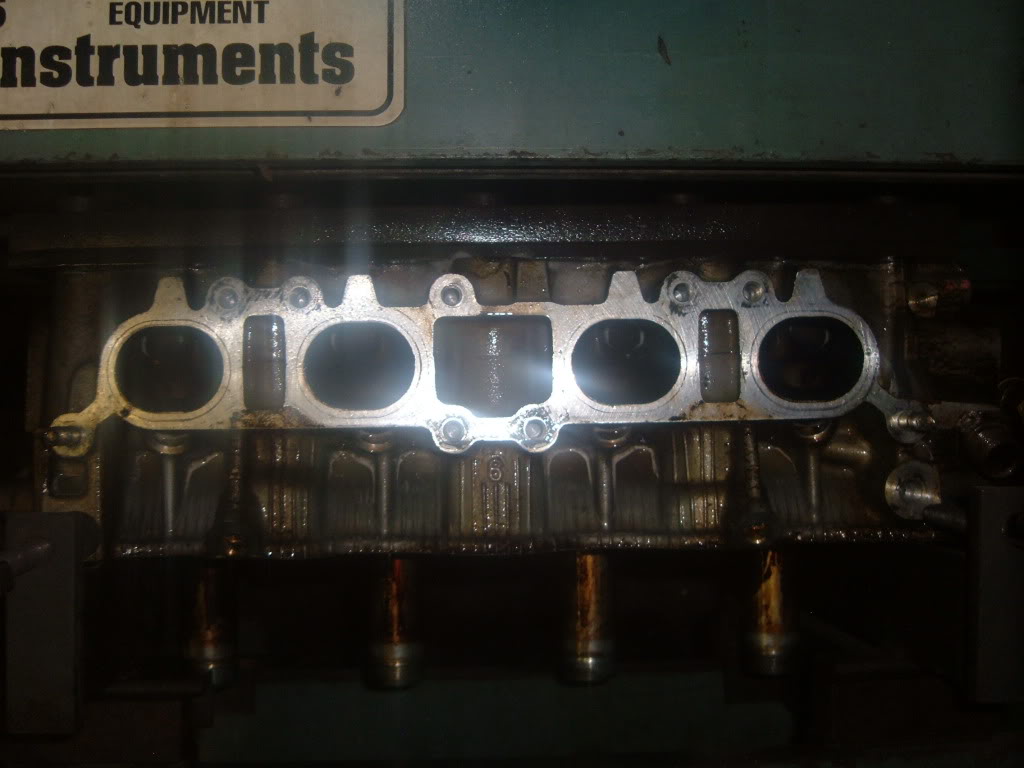 The subject head is a 5sfe Toyota DOHC The procedure will be the same for any head. First all the old gasket material has to be removed around all the water ports in the head. Head gasket, thermostat, any ports that flow water. This procedure is usually done after the head has been checked for warp. Once that is done the head is placed in the pressure testing fixture. Next the proper test plate is selected from the stack. This plate fits this head. See how it covers all the water ports on the head deck. Next the clamping bars are placed over the head and tightened down. any other water ports are blocked of with plates or plugs. One plate has an air fitting so compressed air can fill the water jacket. On the right end of the head. Compressed air fills the water jacket, appox 30psi. Soap water is then sprayed over the head, Looking for bubbles from a crack. Another side. Great care is used in the combustion chambers, and all runners, along with the top of the head. This head was good and showed no signs of cracks for coolant to leak from. |