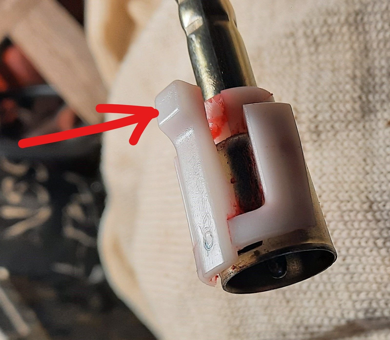 Undo the round cable connector (pic4) on LHS behind cluster - the trick is to reach behind the connector and find the U-shaped clip shown by the red arrow - push the clip gently in the direction shown, while at the same time pulling gently on the connector (toward engine)