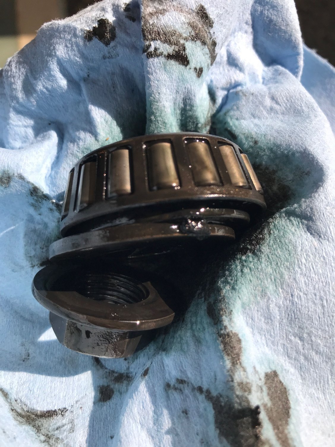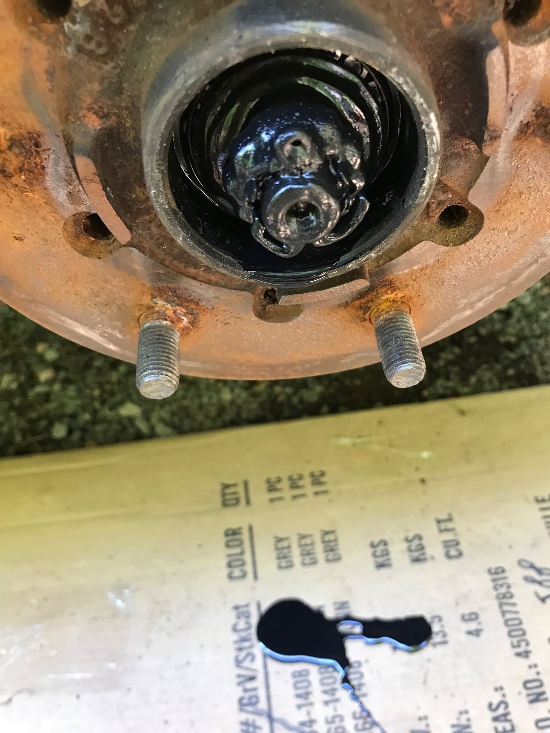 Good close up of paint oxidation - this is gonna take some elbow grease to recover These front brakes don't look so great Even worse looking (and smelling) with the bearing cap removed Bearing on the "burned" side Yes, I think it's safe to say these pads are due for a replacement Much better