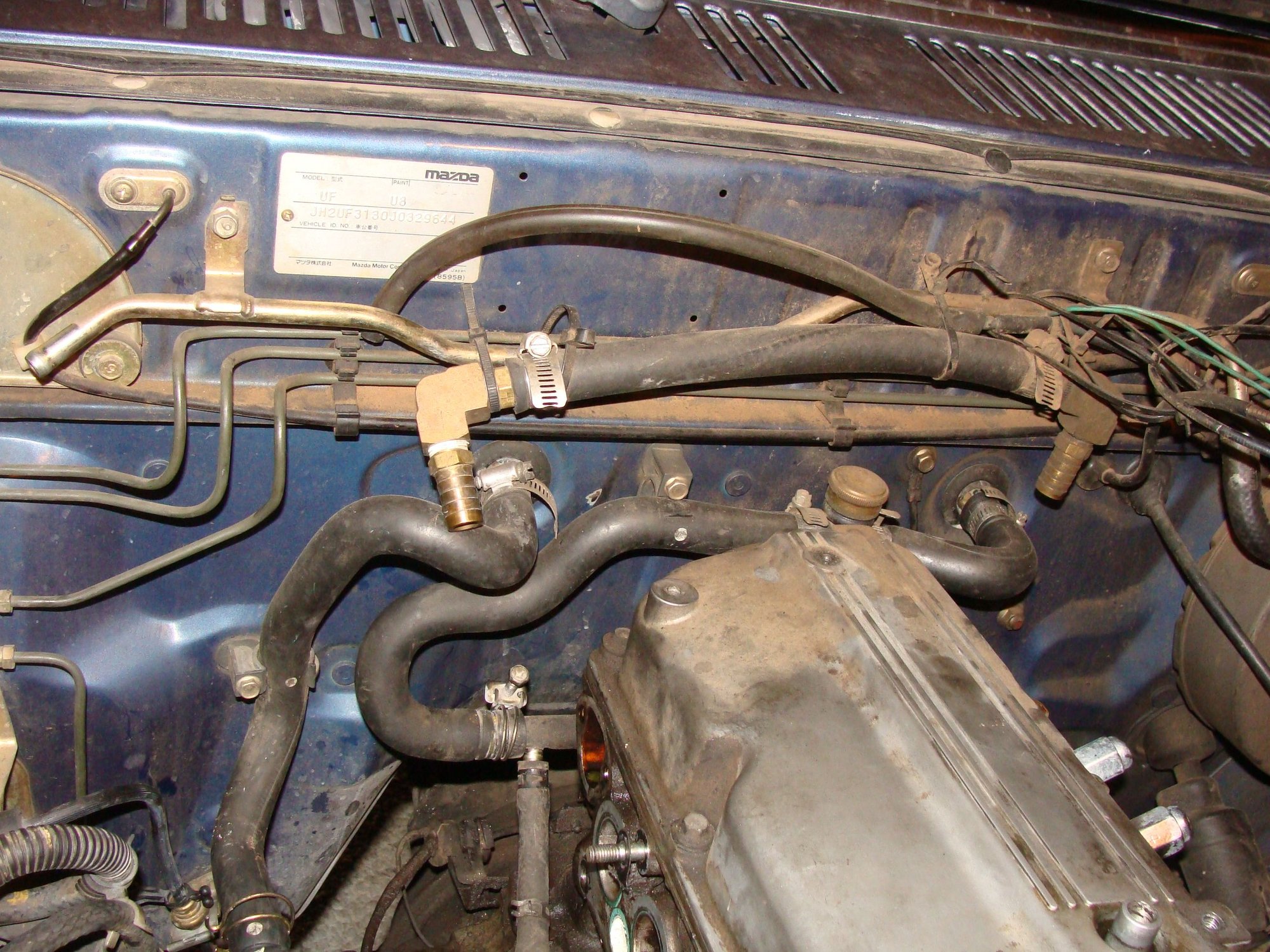 10mm i.d. by-pass hose parallel to cylinder head almost-straight hose going toward the /firewall Mazda FE1H-15-288 $6 or Gates 28409