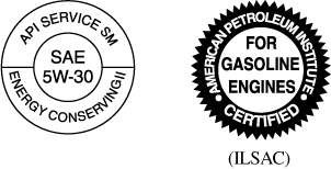 Only use SAE 5W-30 oil “Certified For Gasoline Engines” by the American Petroleum Institute (API).Oil with this trademark symbol conforms to the current engine and emission system protection standards and fuel economy requirements of the International Lubricant Standardization and Approval Committee (ILSAC), comprised of U.S. and Japanese automobile manufacturers.