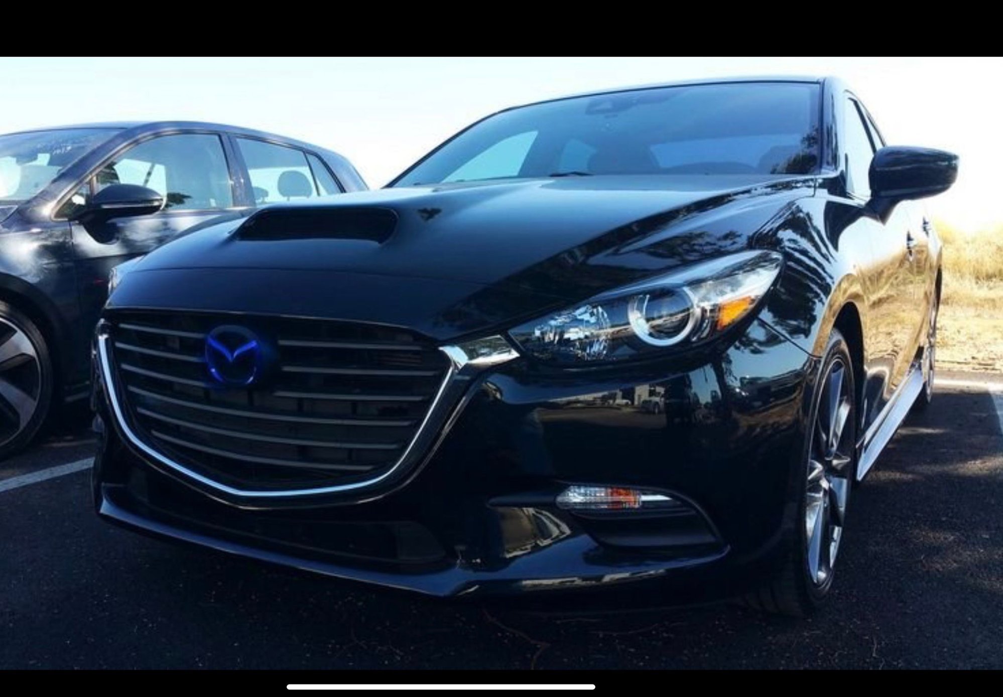 Here is my Mazda after spending about 30 hours preparing the fiber composite hood scoop bonding and then painting the hood factory Mica Black.