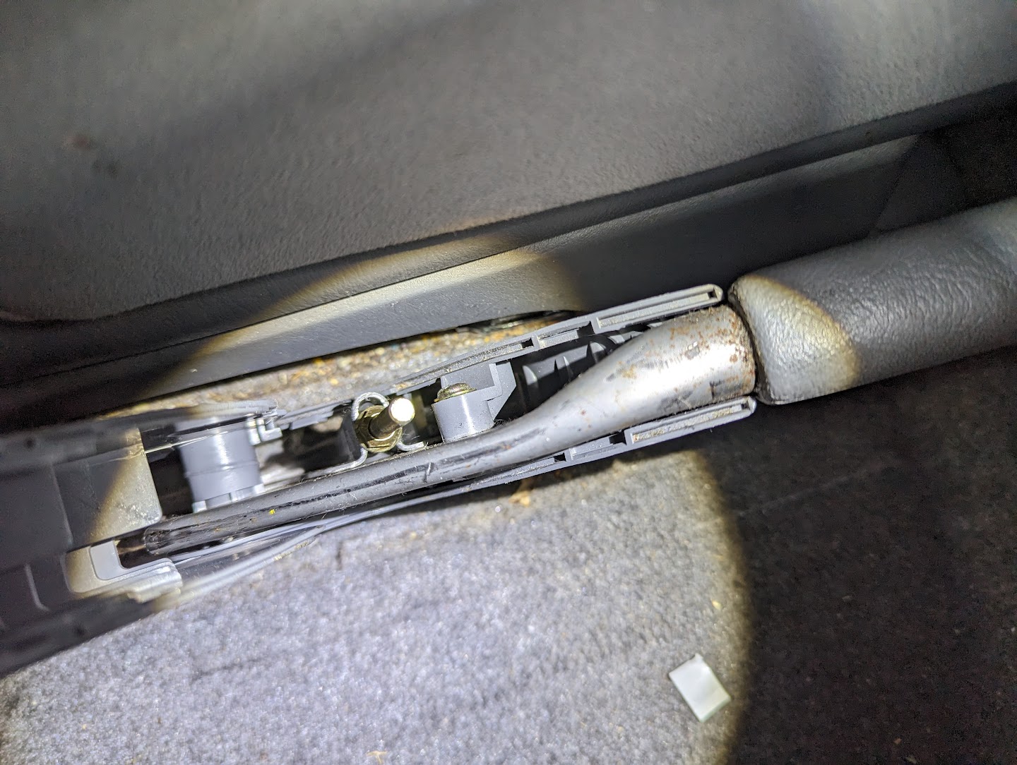 I took apart the e-brake handle assembly and there's a 10mm nut screwed onto a long bolt (you can see it looking above the e-brake). I kept tightening the nut (clockwise) but there's still too much movement. Do I just keep tightening? I'm worried if I try tightening too much, I'll break something.
