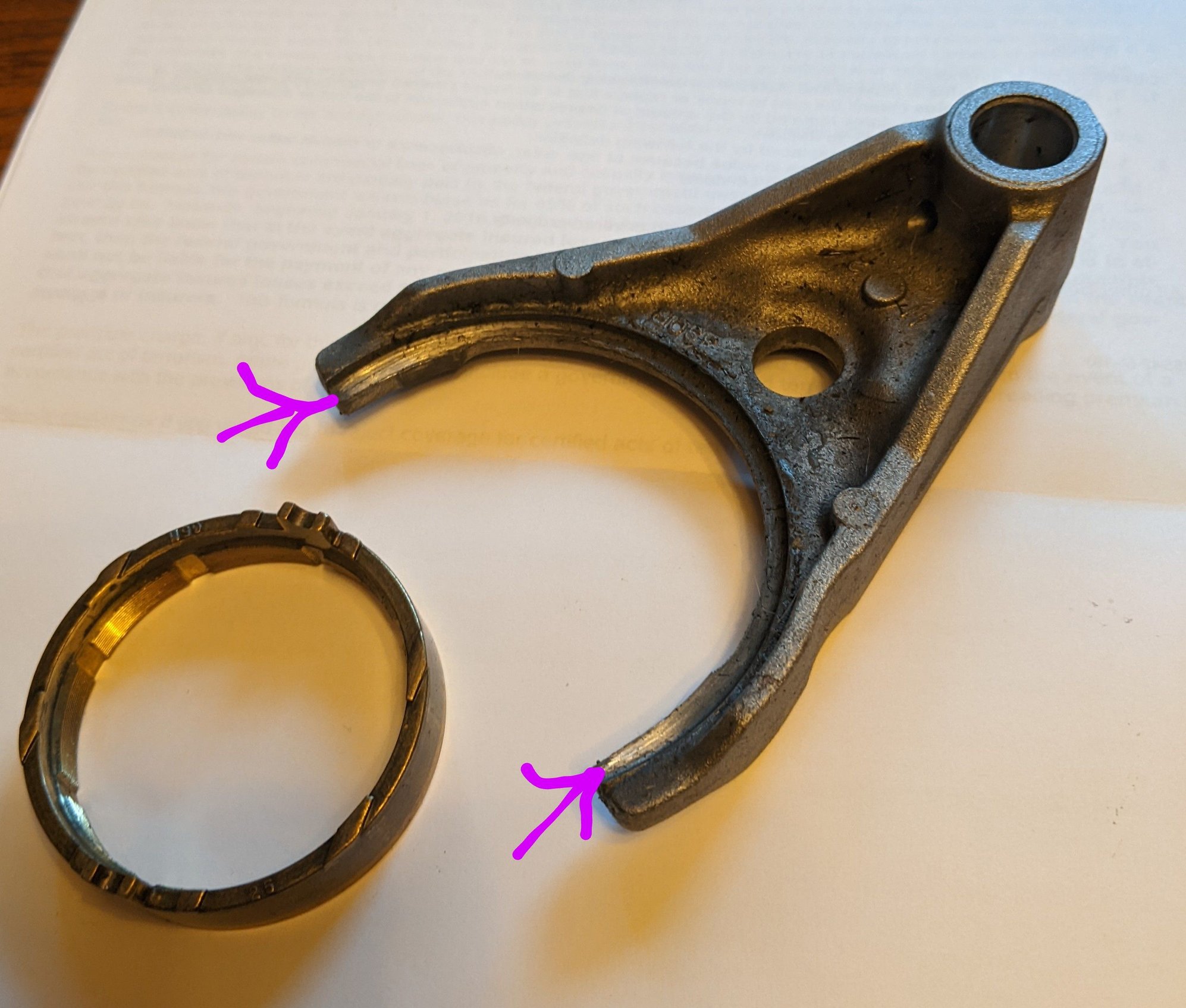 So the pink/fuscia arrows show the wear and tear on the shift fork. The wear and tear goes all the way around the half circle.