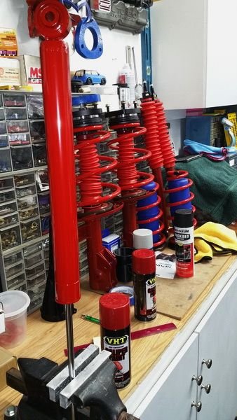 As previous mentioned I do have a full strut, shock ,air bag and spring for a future project to install I wanted something now to compliment the ebach sway bar i just installed. So I rummaged through my part in my garage and found a set of NIB KYB gas-adjust (I think they were for my Explorer?) that are only 1.75 longer then the stock shocks and same shaft and thread diameter. So having left over RED caliper paint from painting the calipers on the Mazda (another install project another day) I shoot the "fuggly" color silver shocks upgrading their looks to RED!