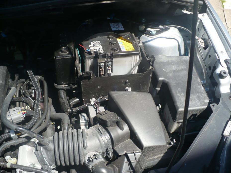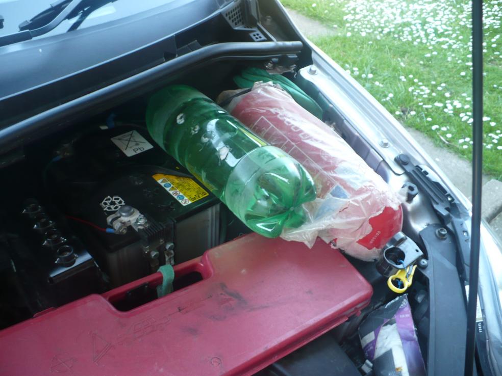 To make space for a few of these at the front, under the bonnet, I removed what appeared to be a venting duct to the enclosed battery. I removed the battery cover and 1 screw holding (near headlamp top) the ducting to the battery compartment. I assume that its purpose was to disperse the explosive gasses produced by the battery under normal running conditions. This left me with 'headroom' to fit fire extinguisher, warning triangle, spare bulbs, first aid and even a disposable camera (for emergencies, evidence and fun). See pictures. You must of course ensure that any of these items cannot fall or foul any part of the running gear or engine. In the picture is Triangle in its box, extinguisher, first aid kit disposable camera in box/foil and the spare bulbs wrapped appropriately and 1 small dayglow jackets. Also a bottle of water can be located here too.