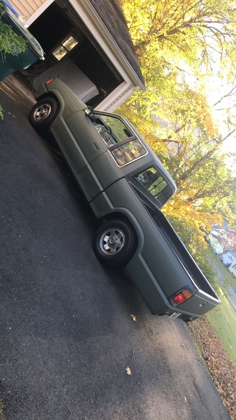 I trailered both of the half-vehicles to my work to begin the swap. I pulled the 1992 2bl and trans with the entire emissions and wiring setup out of the green truck, and tossed the entirety into the red one. Then i pulled all of the goodies off of the green parts truck and scrapped the remains. I had to put in a new fuel pump, pads, rotors, wheel cylinders, some seats from a 2012 subaru, and basically the best parts of the two went into the red one. Since it had green doors and tailgate i used some leftover gallons of plasti-dip to paint the whole truck camo green. Came out.... decent.