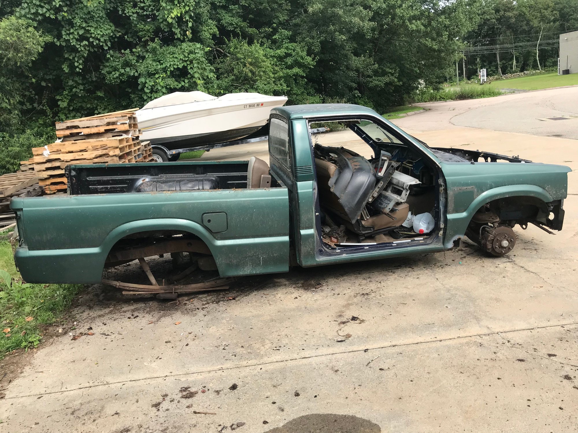 My truck build began this summer (2018). I have always wanted a mazda mini truck since I was 14, and i saw a PERFECT red b22 at a body shop on my commute to work every day. One day i stopped in and asked about the truck: It was the owners father's truck which he daily drove every day and it was certainly not for sale. I could tell the old man was emotionally attached to the truck. But upon further questioning the old man took me out back and showed me his old 1992 b2200 which was rotting away under a tree behind the shop. The frame was completely rotted away almost to the point where the truck was in half. the motor and trans were perfect though, only 110K miles. Bought that rotten truck for $100. And so my journey began.