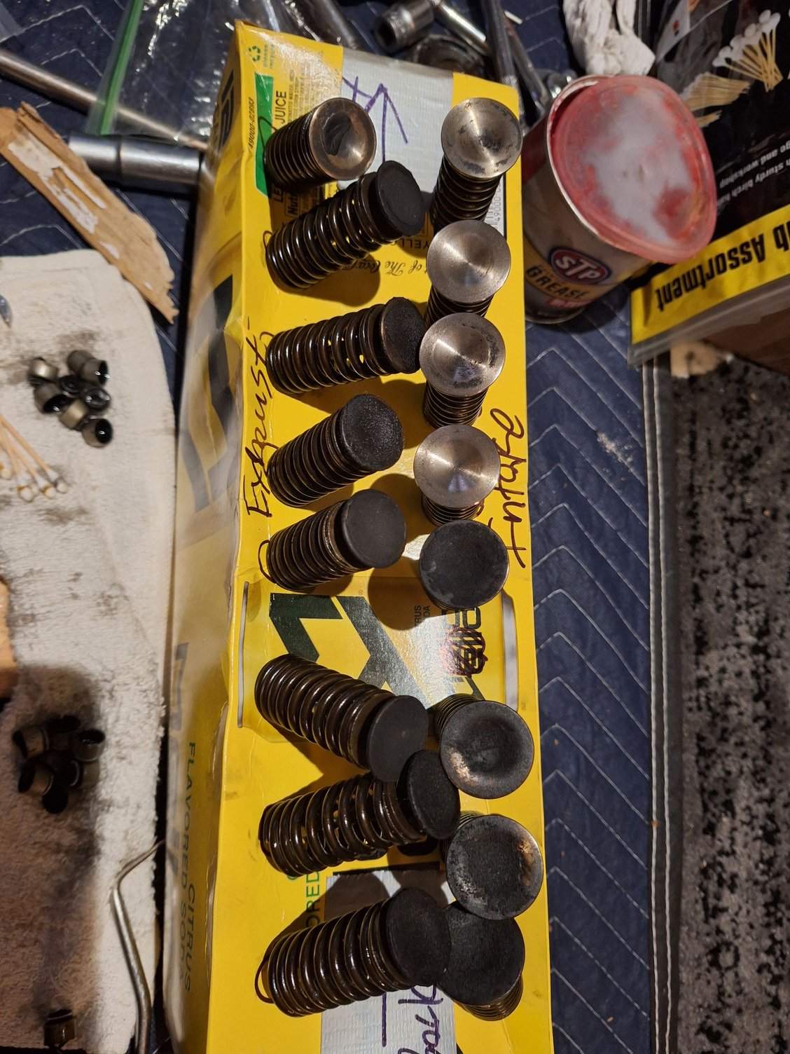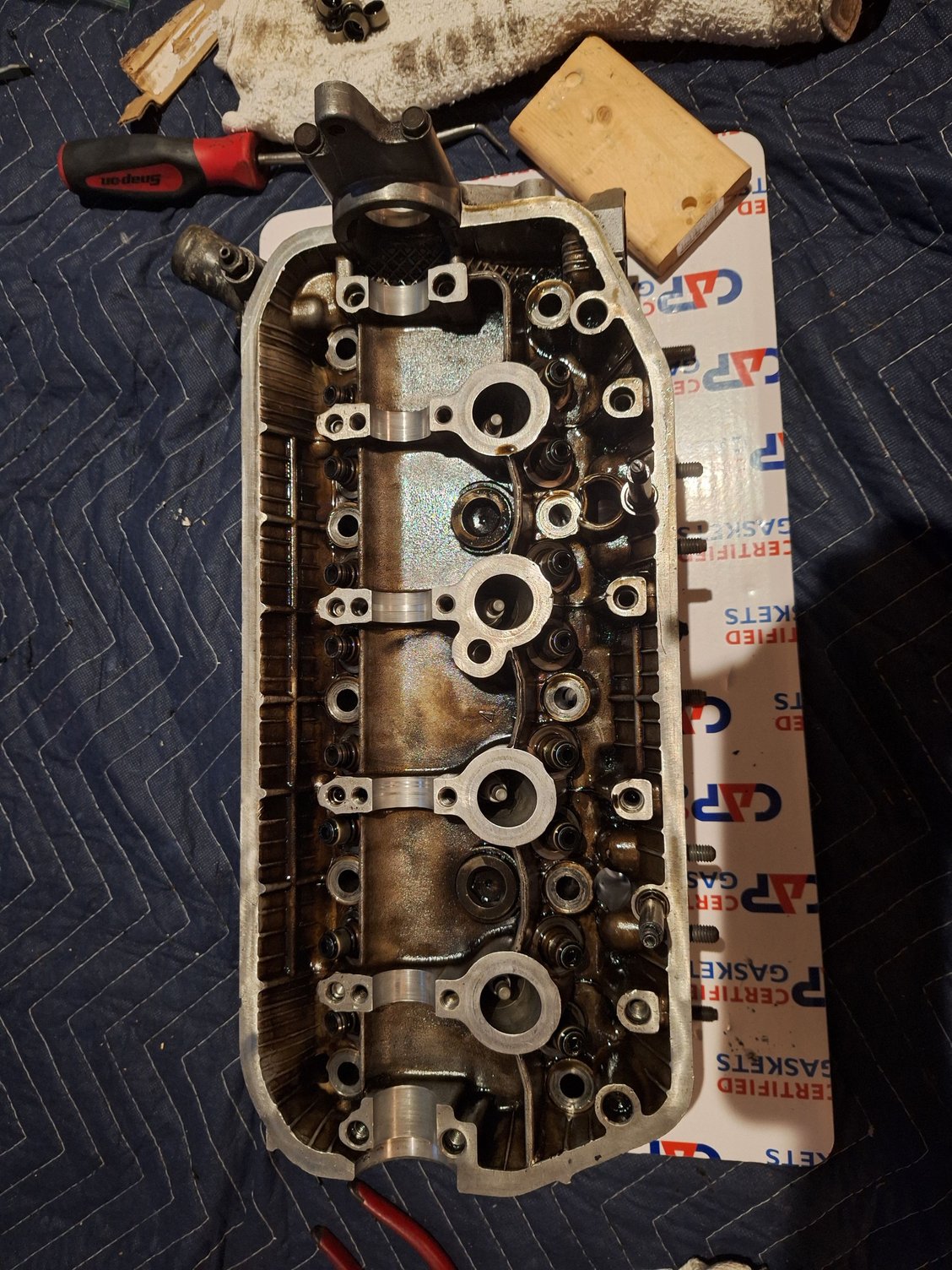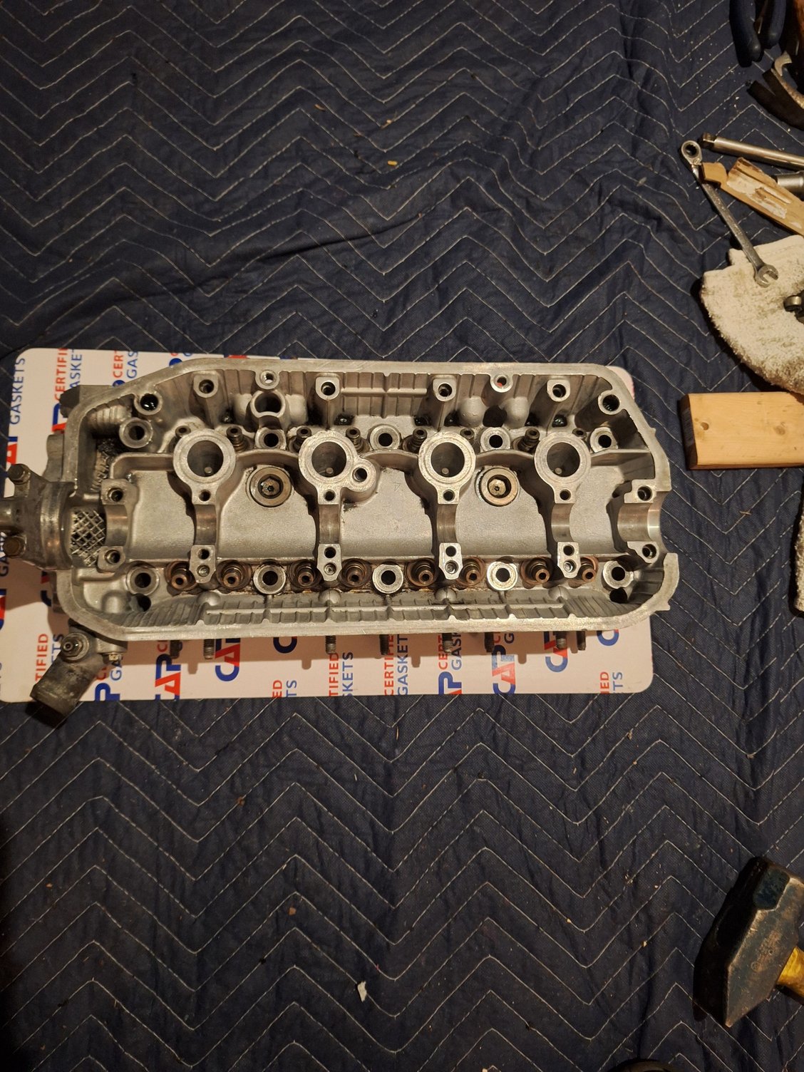 Cleaning a head in the dark... not my favorite thing to do. I am going to just brush out the exhaust ports and spin the valves in a drill and hit them with steel wool.