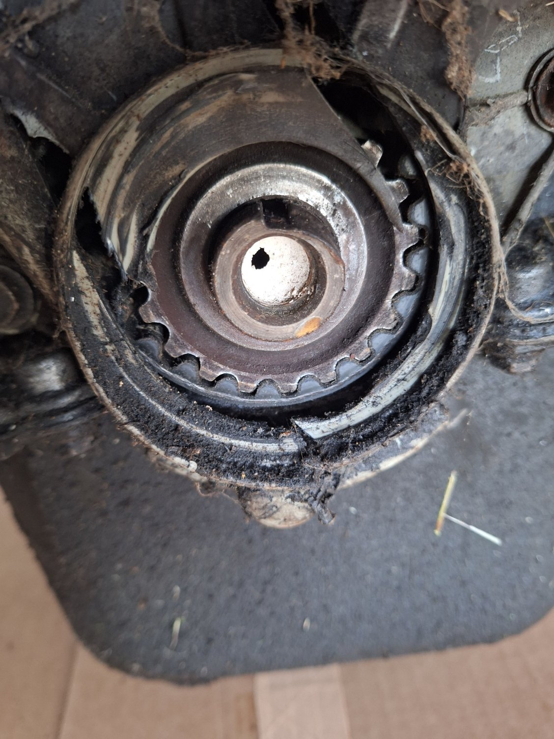 Also, it appears that someone decided they didn't need that timing belt guide washer behind the balancer. So the timing belt ate through the cover.