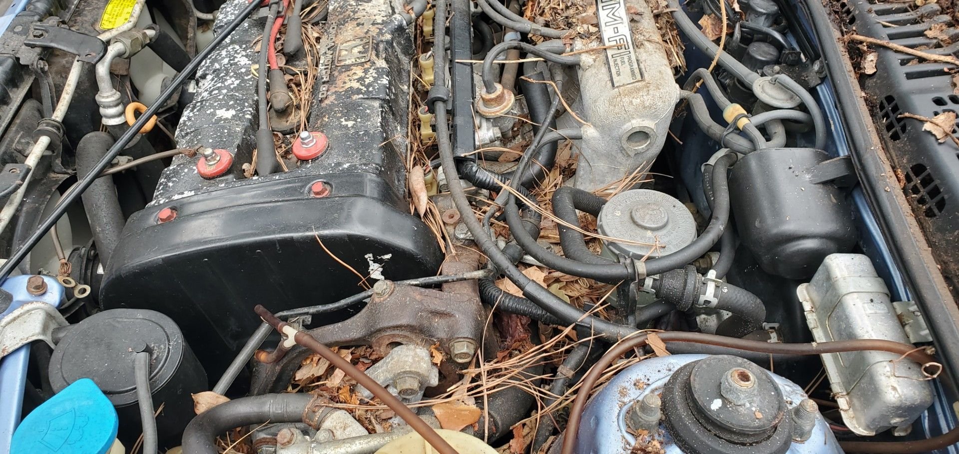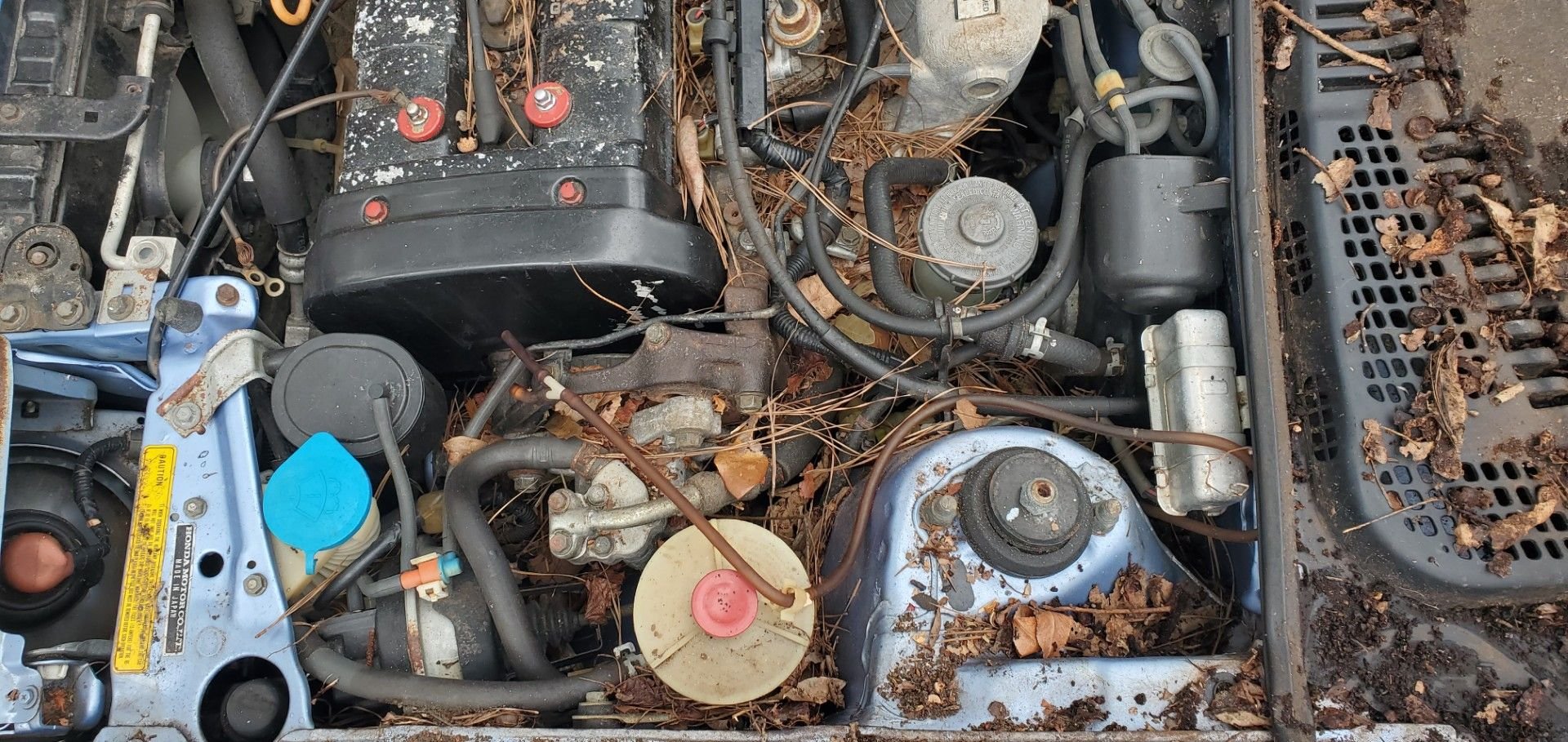 Don't let the pine straw & leaves fool you.......hood has been on the vehicle the whole time, until I decided to yank the engine and trans. Around here the tree rats (Squirrels) like to try and make nests under the hood of a closed car.