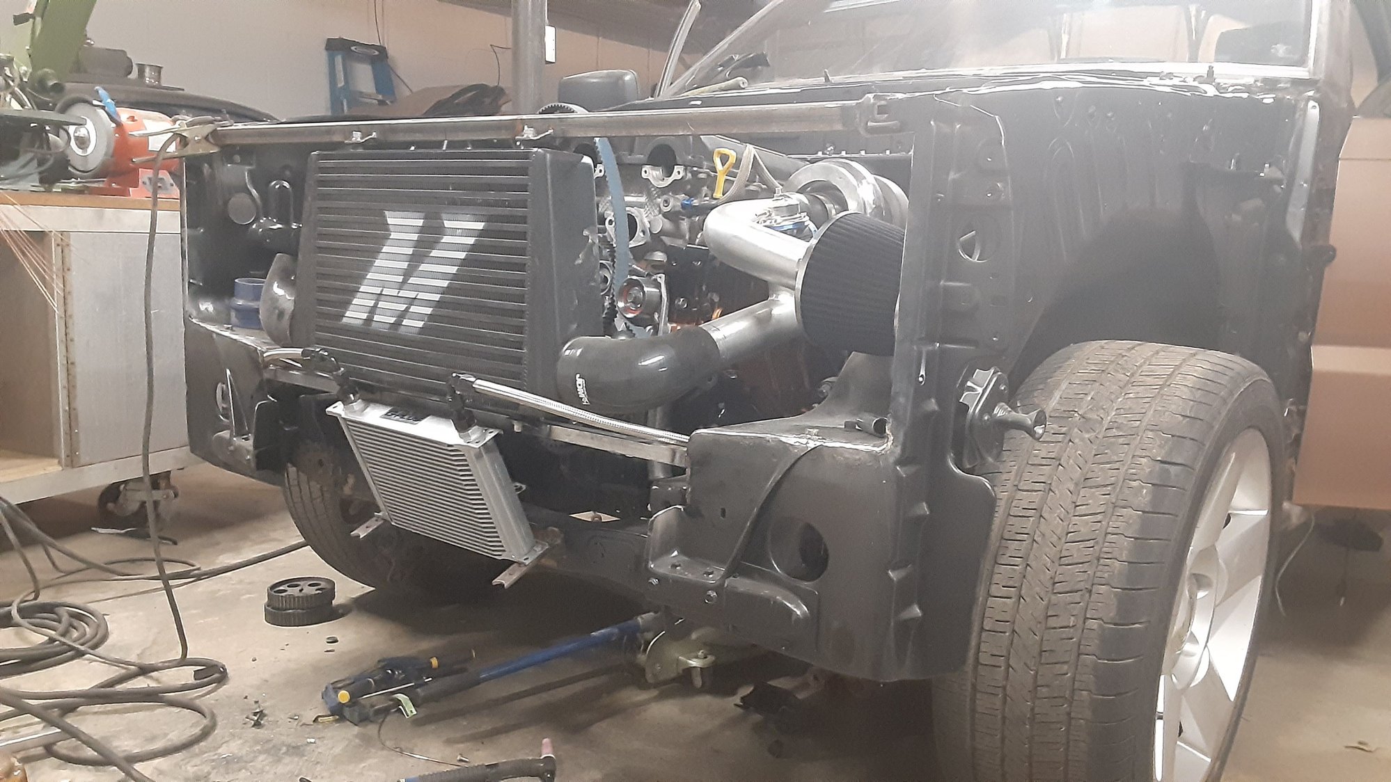Sheetmetal intake, 650cc injectors, Walbro 255, DSM TD05 20G turbo, VW VR6 valve springs, full port and polish, polished combustion chambers and valves, ARP studs throughout entire engine, MSD hall effect crank pos censor, Megassquirt MS2 Exxtra, DD-EFI 12.3 digital dash, Ford 4.6 75mm throttle body and IAC, Mishimoto FMIC, Snow performance water/methanol stage 2.5, 3 pass aluminum radiator, front mounted remote oil cooler, Ford 8.8 rearend, 3.73, LSD, disk brake, narrowed and 4 linked, Moser engineering custom axles 5x114.3 bolt pattern. 2015 Hyundai Genesis coupe heated and electric leather seats, Kenwood Excelon 10" in dash unit, 6¾ components, 600x4 amp, 1000x1 mono amps, Hertz 4" coaxial rear speakers, 2 JL audio 8W3s in ported enclosures.